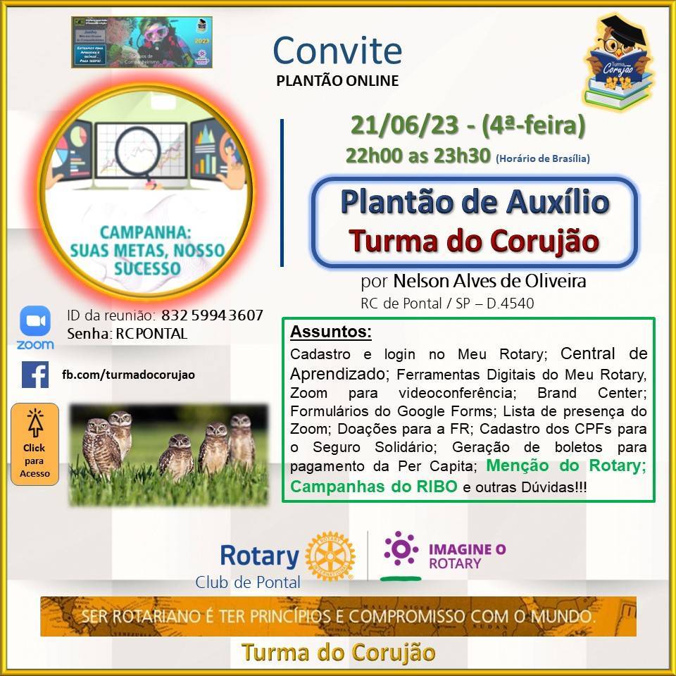 Cadastro e login no Meu Rotary; Central de Aprendizado; Ferramentas Digitais do Meu Rotary, Zoom para videoconferência; Brand Center; Formulários do Google Forms; Lista de presença do Zoom; Doações para a FR; Cadastro dos CPFs para o Seguro Solidário; Geração de boletos para pagamento da Per Capita; Menção do Rotary; Campanhas do RIBO e outras Dúvidas!!!