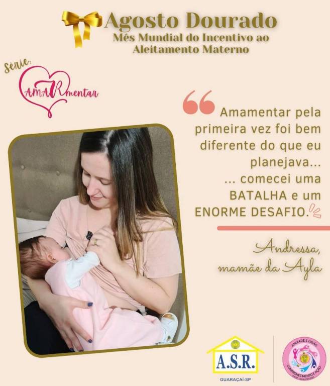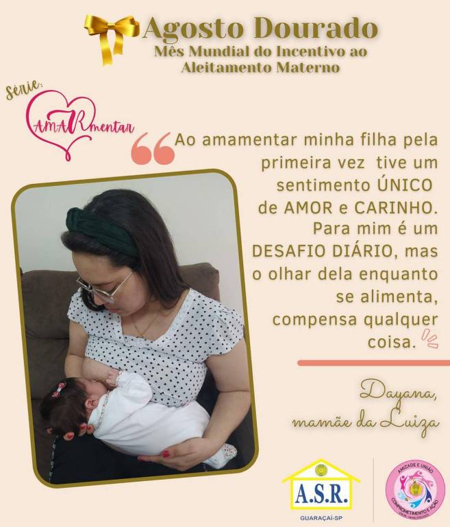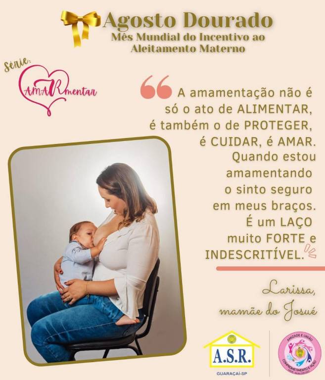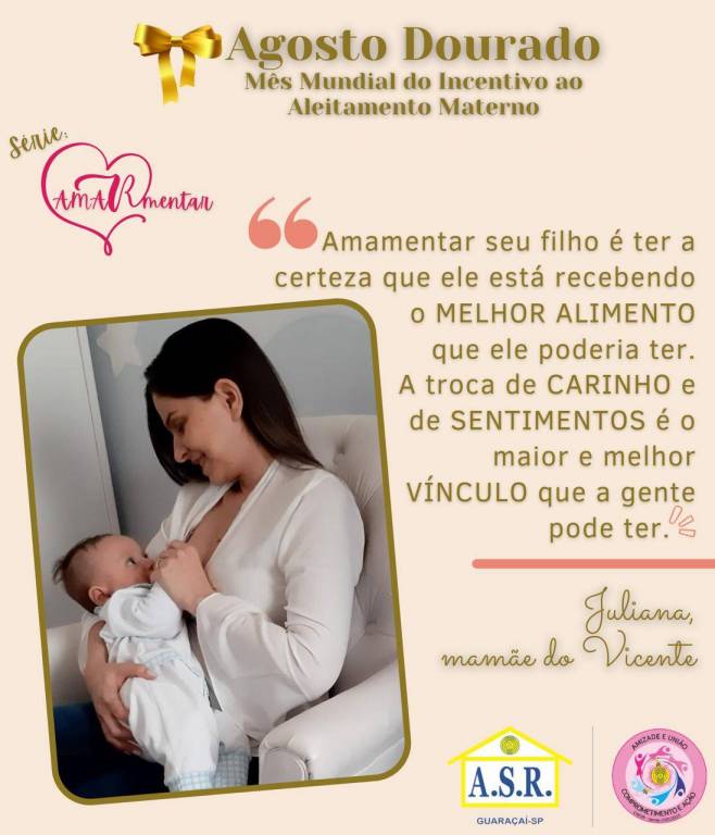 A Associação de Senhoras de Rotarianos Casa da Amizade de Guaraçaí preparou uma semana cheia de informações e depoimentos emocionantes com a série: “Ama(R)mentar”. Durante 6 dias foram publicados vídeo, informações e depoimentos emocionantes e inspiradores sobre esse Ato Único que é o de amamentar. Para ajudar a divulgar a Campanha "Agosto Dourado" a Associação das Senhoras de Rotarianos ASR Guaraçaí preparou um banner e laços alusivos à Campanha para serem usados pelos funcionários da UBS Nelson Rocha em apoio à campanha.
