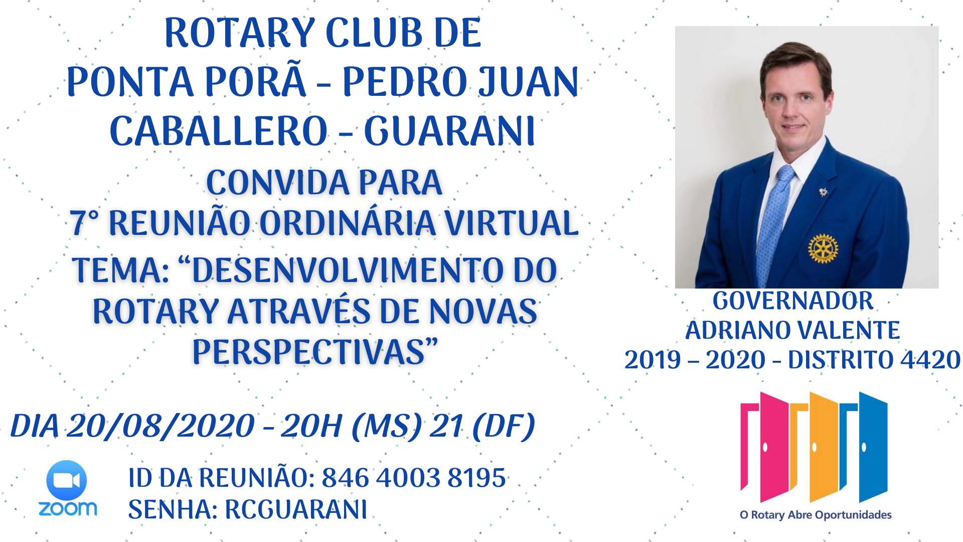 - Tópico: Convida para 7° Reunião Ordinária Virtual - Palestra Governador Adriano Valente 2019-2020 / Distrito 4420 Tema: “Desenvolvimento do Rotary através de novas perspectivas”